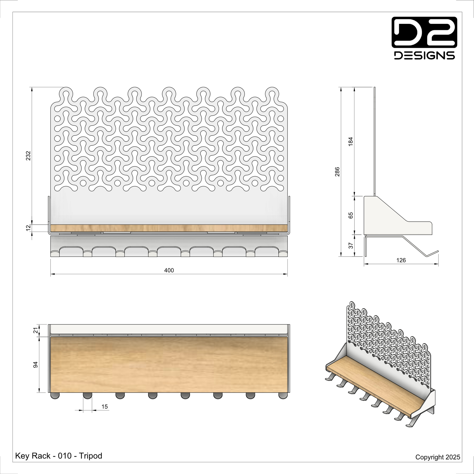 Eight hooks with a wooden shelf and decorative interchangeable back plate.