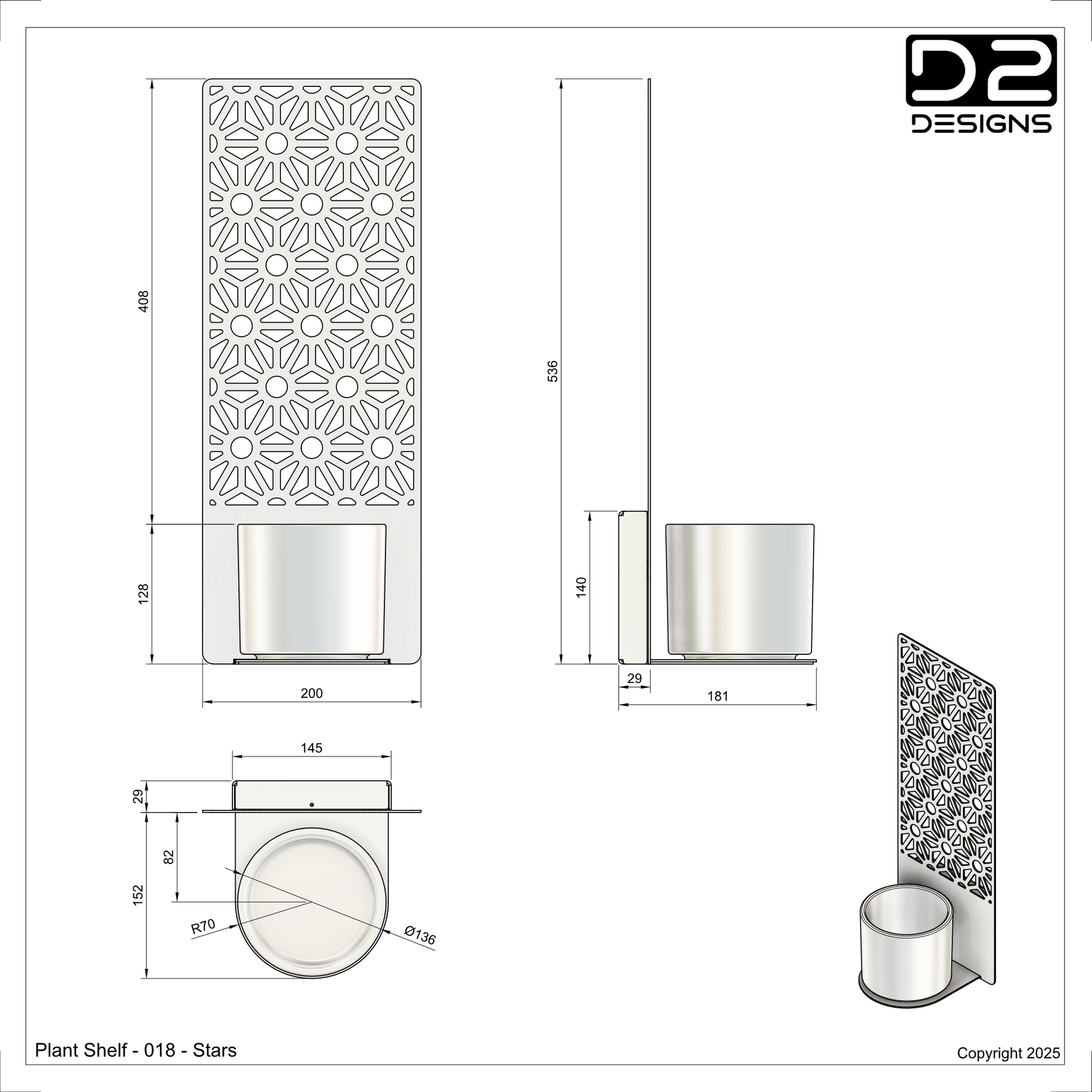 Wall mounted floating pot shelf and decorative interchangeable back plate.
