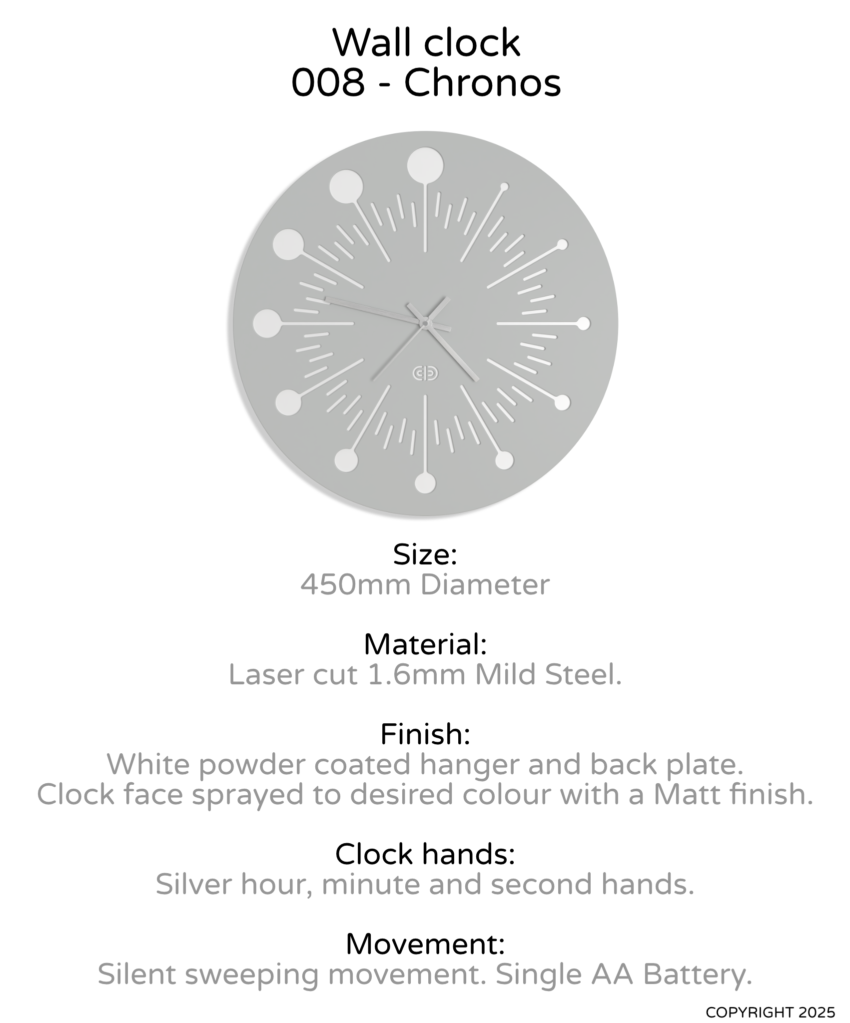 Clock face sprayed to desired colour with a Matt finish.